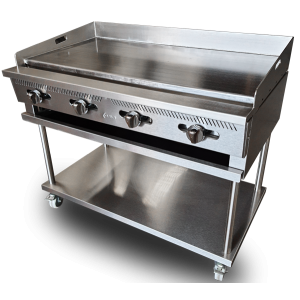 - Con un diseño único que incluye, placa de 1" pulgada de espesor en hierro pulido, 4 potentes quemadores "H" de hierro vaciado, amplio entrepaño y 4 ruedas uso rudo.