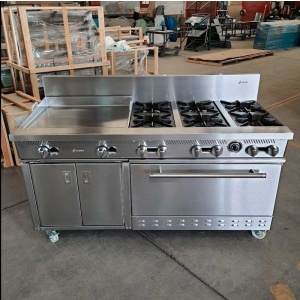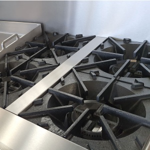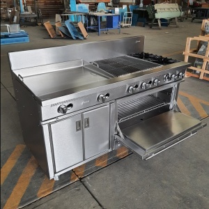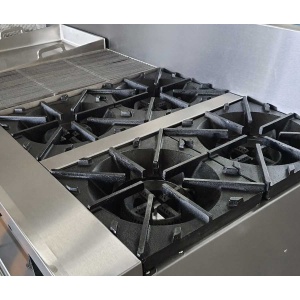 - Estufa industrial multi-dinámica de uso rudo en acero inoxidable. Cuenta con freidora 12 litros, plancha con placa de 3/8″, 6 parillas con quemadores imperiales de hierro vaciado y horno.