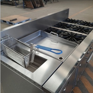 - Estufa industrial multi-dinámica de uso rudo en acero inoxidable. Cuenta con freidora 12 litros, plancha con placa de 3/8″, 4 parillas con quemadores imperiales de hierro vaciado y horno.