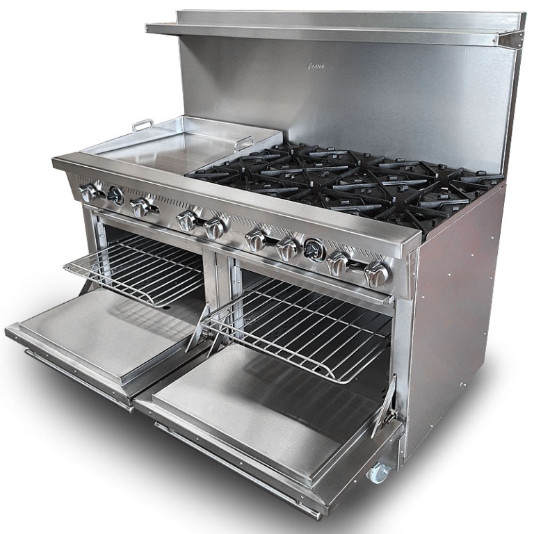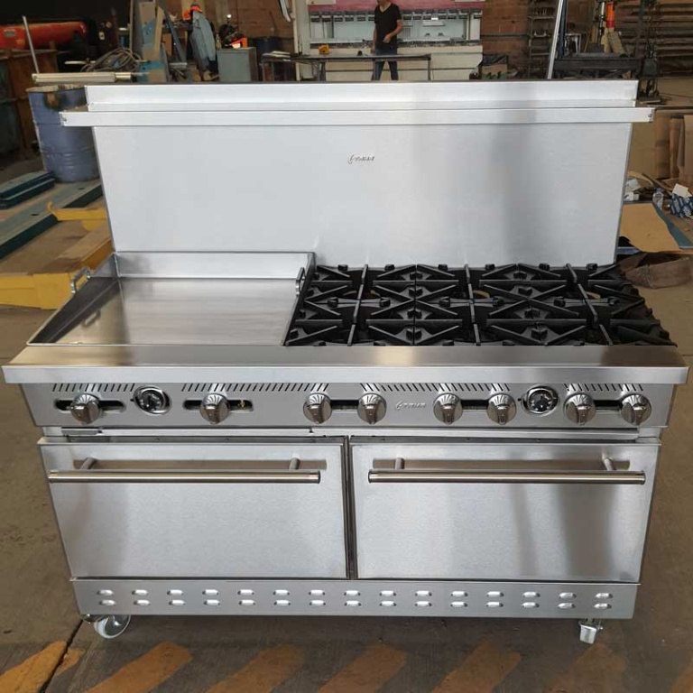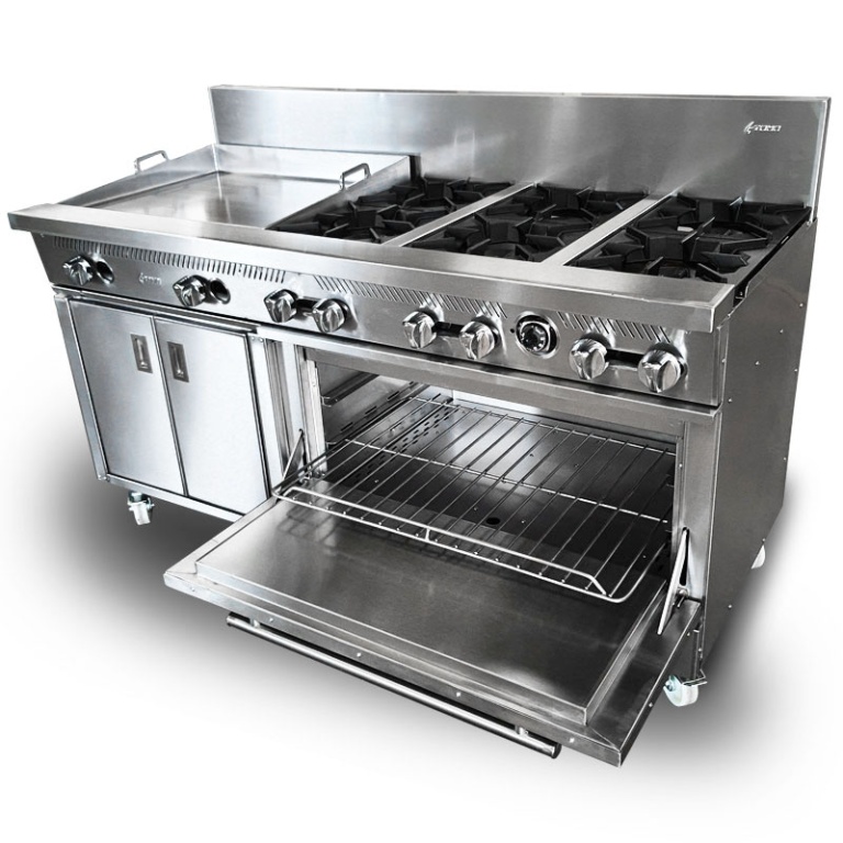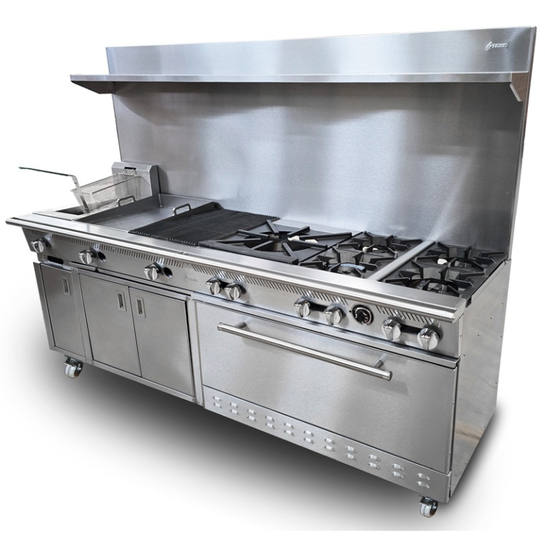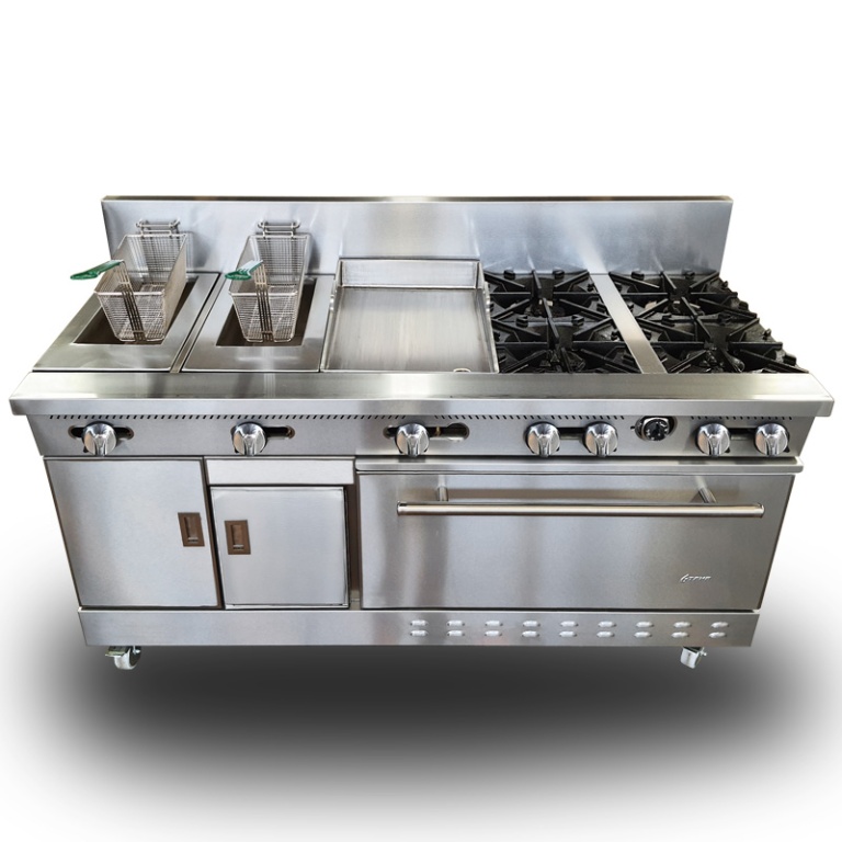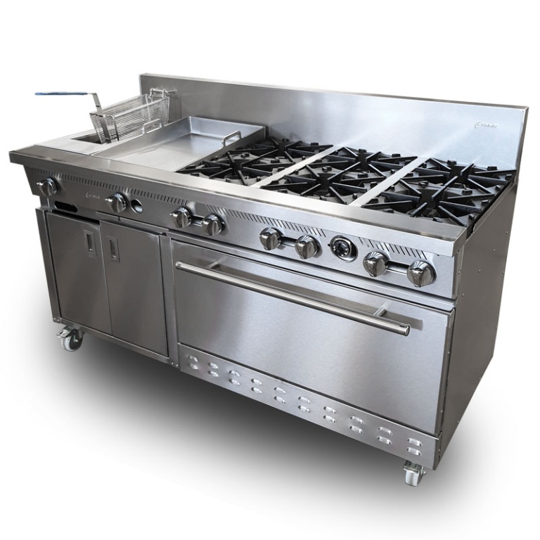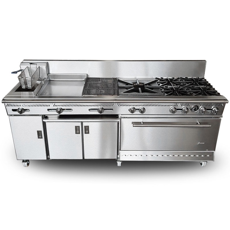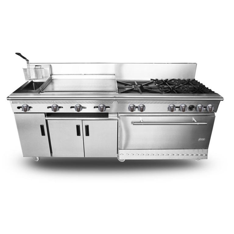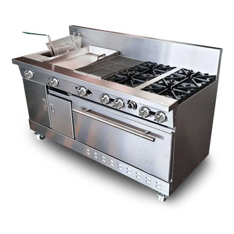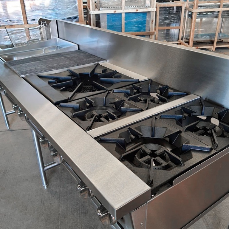 - Estufa industrial multi-dinámica de uso rudo en acero inoxidable. Cuenta con freidora 12 litros, plancha con placa de 3/8″, 6 parillas con quemadores imperiales de hierro vaciado y horno.