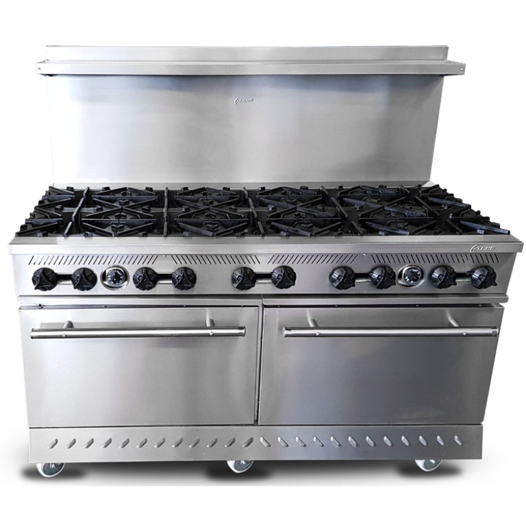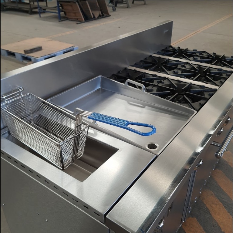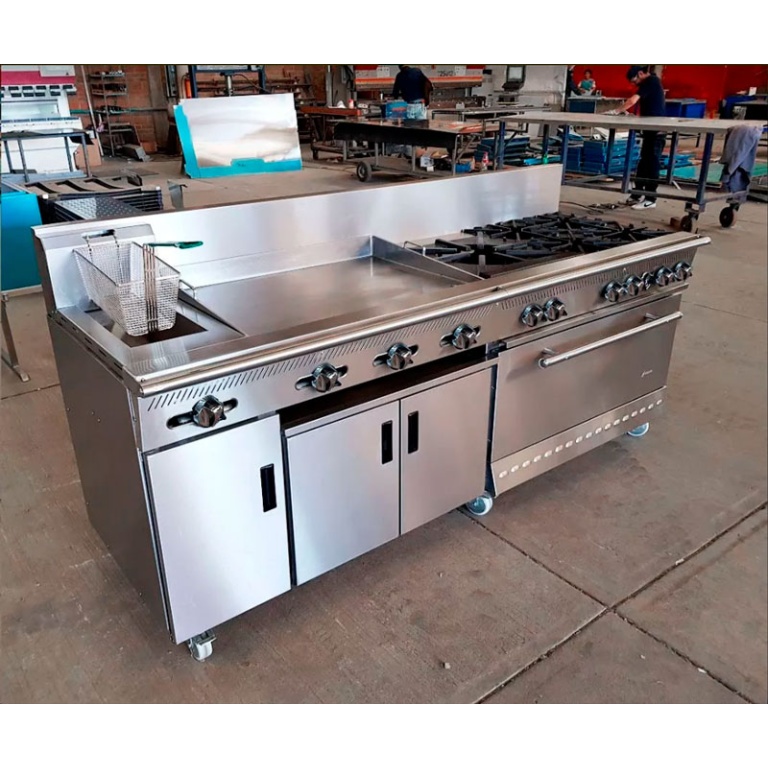 - Estufa industrial multi-dinámica de uso rudo en acero inoxidable. Cuenta con 2 freidoras 12 litros, plancha con placa de 3/8″, 4 parillas con quemadores imperiales de hierro vaciado y horno.