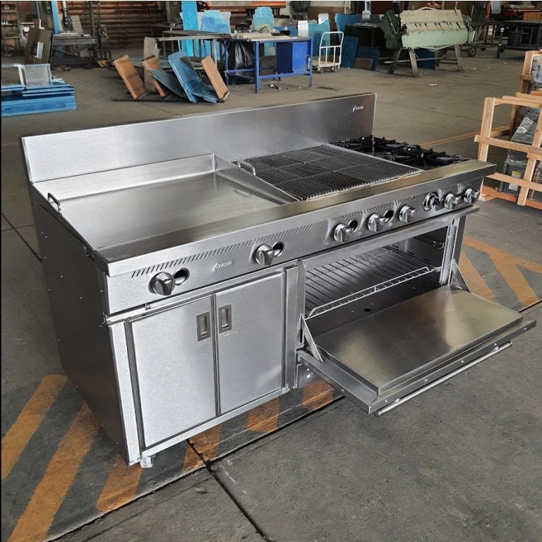 - Estufa industrial multi-dinámica de uso rudo en acero inoxidable. Cuenta con plancha con placa de 3/8″, 6 parillas con quemadores imperiales de hierro vaciado y horno.