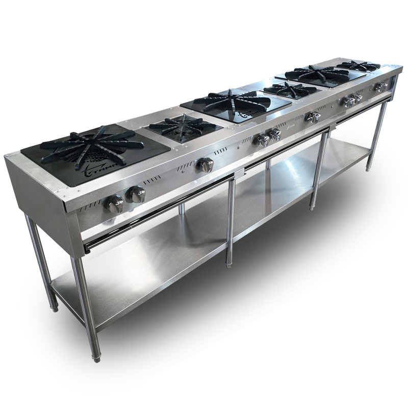 - Estufa lineal Master, 3 fogones con amplias parrillas y quemadores triples + 3 parrillas y quemadores mas chicos de hierro vaciado